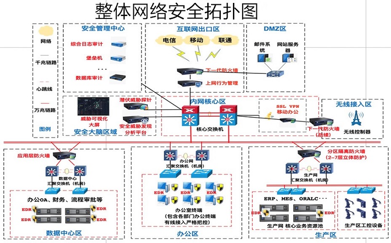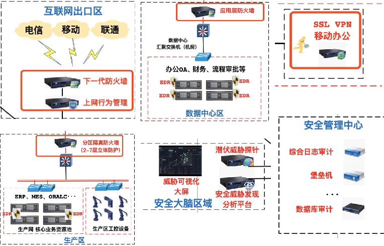 安全域劃分:集團(tuán)網(wǎng)絡(luò)劃分成辦公網(wǎng)、研發(fā)網(wǎng)、生產(chǎn)網(wǎng),數(shù)據(jù)中心網(wǎng),通過(guò)下一代防火墻實(shí)現(xiàn)網(wǎng)絡(luò)的邏輯隔離和安全防護(hù)。