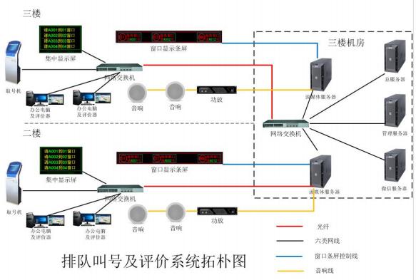 一樓、三樓辦事大廳各設置為一個叫號區(qū)域配套大屏幕電視機。一樓、三樓區(qū)域安裝取票機 1 臺,二 樓區(qū)域安裝取票機 2 臺。各配套大屏幕電視機進行信息集中顯示,以及音響系統(tǒng)進行語音提示。各區(qū)域根
