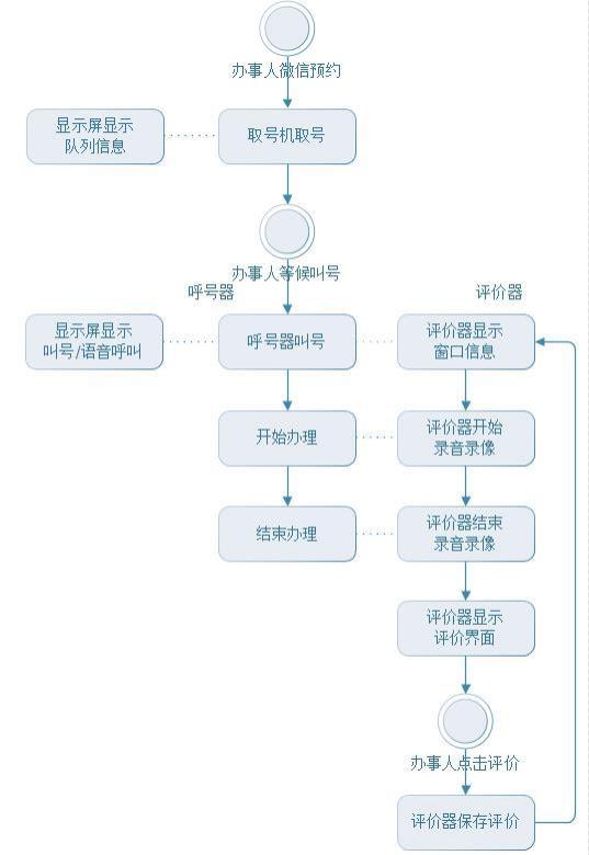 排隊叫號及服務評價系統(tǒng)工作流程圖: