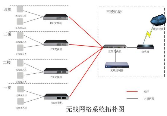 無線網(wǎng)絡采用無線接入點(AP) +無線控制器(AC) 的企業(yè)級無線網(wǎng)絡系統(tǒng)架構,星型拓撲結(jié)構。在